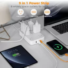 Transform your home, office, or dorm room with this versatile 10FT flat extension cord power strip. Designed with 6 AC outlets and 3 USB ports, including a high-speed USB-C, this power strip is the perfect solution for keeping all your devices charged and organized. The ultra-thin flat plug allows you to maximize space and neatly fit the cord behind furniture or in tight spaces, while the 45-degree angled design ensures other outlets remain accessible.