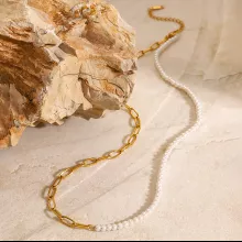 Add a touch of timeless sophistication to your jewelry collection with this stunning 18K Gold Plated Stainless Steel Glass Pearl Chain Necklace. Designed with elegance in mind, this piece showcases delicate glass pearls strung on a durable stainless steel chain, perfectly plated with radiant 18K gold. Its waterproof and anti-allergic properties ensure you can enjoy its beauty worry-free, making it a must-have for any woman who loves classic yet trendy jewelry.