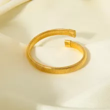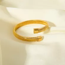 This bracelet combines beauty and functionality, making it the perfect accessory for any occasion. Its sleek and modern design features a delicate open texture that adds sophistication to your look without being overpowering. The PVD 18K gold plating not only ensures a luxurious finish but also makes it resistant to tarnishing, so it retains its radiant shine even with frequent wear. Lightweight and comfortable, this bangle is perfect for women who want a piece of jewelry that works seamlessly with both casual and formal outfits.