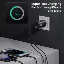 • Triple Port Design: Features two USB-C and one USB-A port for charging multiple devices simultaneously.
