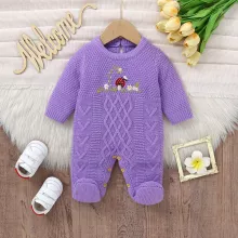 Wrap your little one in cozy charm with this adorable knit baby romper, designed to keep them snug and stylish all season long. Crafted from soft acrylic, this romper is gentle on delicate skin and provides the perfect layer of warmth for autumn days and cooler spring or winter mornings. The whimsical mushroom embroidery adds a playful touch, making this romper a standout piece in your baby’s wardrobe. With its easy pullover style and classic O-neck design, this romper is as practical as it is cute.