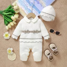 This romper set is perfect for daily wear, family gatherings, photoshoots, or as a thoughtful baby shower gift. The soft knit fabric ensures your baby stays comfortable whether indoors or outdoors, while the full-length sleeves and foot-wrapping design provide added warmth during the cooler months. The charming solid color and adorable matching hat make this outfit a stylish choice for any occasion.