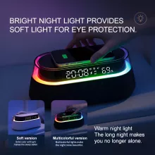 This Bluetooth speaker is ideal for anyone seeking a high-functioning yet compact device that fits easily into their lifestyle. The powerful 15W wireless charging pad keeps your devices ready to go, while the built-in digital clock and night light make it a versatile addition to your bedroom or workspace. With Bluetooth 5.0 connectivity, it provides smooth streaming for music, podcasts, and more, and its sound modes—3D Surround, Stereo, Sleeping Mode, and Standard Mode—allow you to tailor the audio to your activity.