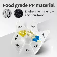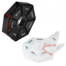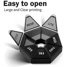 - Seven-Sided Design – This unique, seven-sided layout allows you to organize medications or supplements for each day of the week, helping to simplify your routine and ensure you stay on track.