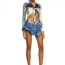 The skirt’s denim-like pattern gives it a cool, casual vibe—perfect for dressing up or down. Whether you’re pairing it with a fitted tank top and sandals or layering it with a jacket and boots, this skirt adapts seamlessly to your personal style. It’s a standout piece that’s ready for weekend brunches, shopping trips, casual Fridays at the office, or summer music festivals. The asymmetrical design brings fluidity and bold contrast, making sure your outfit is never boring.
