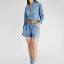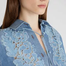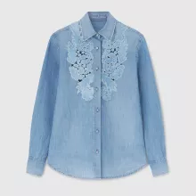 The shirt features a classic collar and a front button closure that give it a structured, polished look. The delicate floral lace embroidery on the front of the shirt adds a soft, feminine touch that stands out beautifully against the rugged denim. Whether you’re dressing it up for a casual brunch or dressing it down for a laid-back day, this shirt effortlessly blends comfort and style.