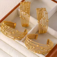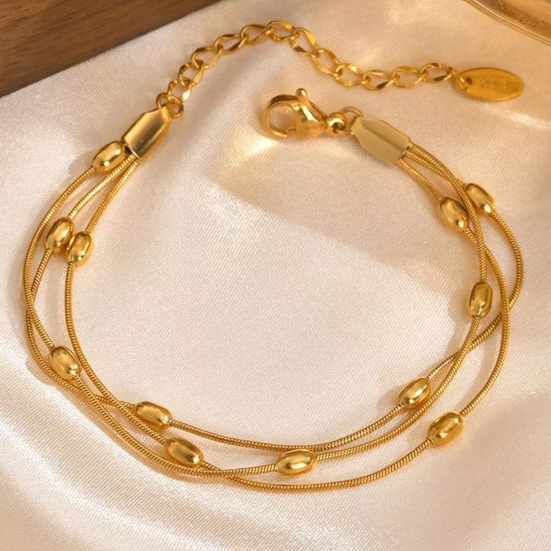 The Fashion Multi-Layer Twisted Circle Combination Bead Bracelet is a stunning accessory designed to add a touch of elegance to any outfit. Crafted from high-quality stainless steel and plated in 18K gold, this bracelet boasts a timeless and trendy design. With its multi-layer construction, twisted circle accents, and delicate bead details, this piece is the perfect blend of modern sophistication and classic charm. A versatile addition to any jewelry collection, it’s suitable for every occasion, from casual outings to formal events.