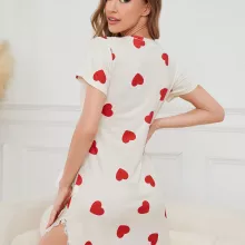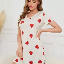 Embrace the perfect blend of style and comfort with this heart print lace hem nightgown. Designed for modern women who value a touch of elegance even during their downtime, this V-neck pajama dress features a delicate lace hem, a charming heart pattern, and a thoughtful side slit for ease of movement. Made from high-quality fabrics, it offers a silky smooth texture and a skin-friendly feel, ensuring your nights are as luxurious as they are restful.