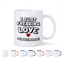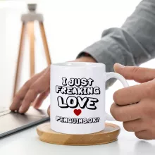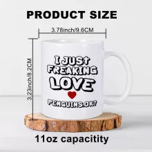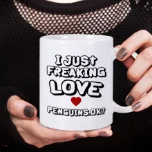 - Design: Features a playful and bold “I Just Freaking Love Penguins OK” message with a charming penguin graphic on both sides of the mug.