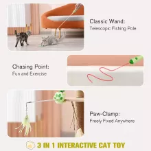 - 3-in-1 Design: Use it as a fishing rod with feathers or ring ribbons, mount it on tables or cat towers, or project a laser dot for endless entertainment.
