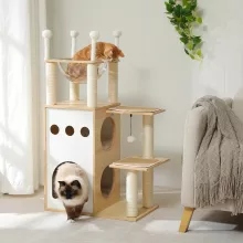 Transform your home into a feline paradise with the Modern Wooden Cat Tree Tower. This all-in-one cat furniture is designed to cater to your cat’s natural instincts, offering the perfect mix of fun, comfort, and style. With its sleek wooden design, it not only enhances your home décor but also provides a secure and interactive environment for your furry friend. Whether they are looking for a place to nap or scratch, this cat tree delivers everything they need in one convenient structure.