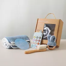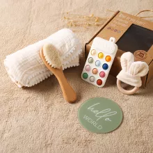 This all-in-one gift set provides new parents with quality essentials and photography props to capture those early milestones. The wooden brush is designed to be gentle on a newborn’s scalp, making it a lovely addition to baby’s first grooming routine. The crochet rattle rings introduce babies to soft textures, encouraging them to explore and learn through touch. Parents will adore the milestone cards, which allow them to photograph and share each precious moment, from first smiles to first steps. The soft blanket and towel are ideal for snuggling or as a beautiful backdrop for photo sessions.