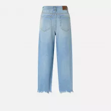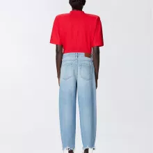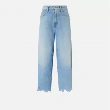 With a front zipper-and-button closure, these jeans provide a secure and reliable fit. The addition of belt loops on the waistband offers the opportunity to further customize the fit, giving you control over how they sit on your body. The real showstopper, however, is the raw-cut, ripped hem. This design detail adds a subtle touch of rebellion, making these jeans the perfect blend of contemporary fashion and casual comfort.