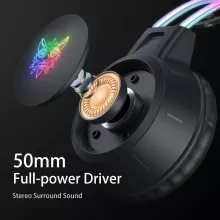 This gaming headset features a powerful 50mm driver that delivers clear, precise audio with deep bass, bringing your games to life. The 7.1 surround sound technology enhances the audio experience, helping you pinpoint in-game sounds like footsteps, gunshots, and environmental cues for a competitive edge. The omnidirectional microphone picks up your voice clearly while minimizing background noise, ensuring crisp communication with your teammates. The headset also features dynamic RGB lighting, adding a cool aesthetic to your setup while you game. With an ergonomic design, lightweight frame, and full earmuffs, this headset provides lasting comfort, perfect for long gaming sessions. The adaptive head beam ensures a snug fit, making it an ideal choice for gamers who wear glasses.