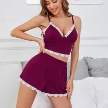 Unwind in style with our Sexy Lace Trim Women’s Pajama Set. This two-piece sleepwear ensemble includes a sleeveless V-neck crop top and matching shorts, all enhanced with delicate lace trim for an alluring yet elegant touch. Crafted from a luxurious blend of 60% polyester, 35% viscose, and 5% elastane, this set combines softness, durability, and stretch for maximum comfort. Designed to keep you cool and relaxed, it’s perfect for warm summer nights or pampering evenings at home.