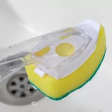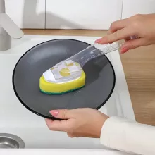 - Soap Dispensing Handle: The dish brush comes with a built-in soap dispenser, allowing you to add dishwashing liquid directly to the handle. Simply press a button to release the soap as you scrub, making it more efficient than traditional dishwashing methods.