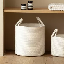 Crafted from 100% cotton rope, this storage basket brings a sense of purity and simplicity to your decor. The round, woven structure not only enhances its visual appeal but also ensures sturdiness and durability. With a waterproof coating on the inside, it’s resistant to moisture, making it ideal for storing laundry, towels, or any items prone to dampness. The sturdy handles on both sides allow for easy transportation, even when filled. Its neutral white color ensures it seamlessly fits into any home decor, from nurseries to living rooms.