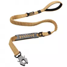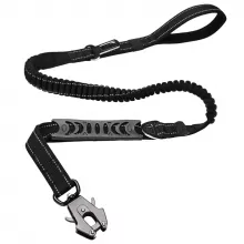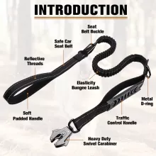 Walk, train, and travel with confidence using this tactical, heavy-duty dog leash, built to withstand the strength of even the most powerful dogs. Designed with durability, safety, and comfort in mind, this leash features an advanced frog clip with a double-locking mechanism for secure attachment, a shock-absorbing bungee for reduced pulling impact, and two padded handles for optimal control. With reflective stitching for night visibility and an integrated car safety buckle, this leash is perfect for any adventure with your dog, whether in the park or on the road.