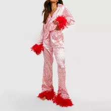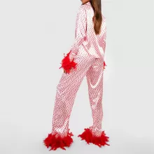 This pajama set is more than just sleepwear – it’s a statement of comfort and style. The heart print exudes romantic charm, while the feather cuffs add a touch of luxury. Perfect for relaxing on Valentine’s Day or any night you want to feel pampered, this set combines playful details with practicality.
