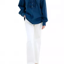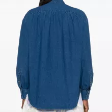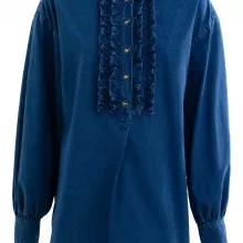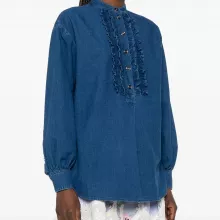 The shirt features a clean, modern crew neck collar, making it versatile for layering or wearing solo. The front closure with tastefully decorated buttons adds a refined touch, giving you the confidence to wear it with both casual and more polished outfits. But what really makes this shirt stand out are the stunning ruffle details along the front. These soft, feminine accents contrast beautifully with the sturdier texture of the denim, creating a look that’s both romantic and fashion-forward.