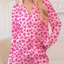 The unique leopard heart print design sets this sleepwear apart, bringing a touch of glamour to your nighttime routine. The blend of spandex ensures stretch and flexibility, while the button-up top adds a touch of elegance. Whether you’re relaxing solo or spending time with loved ones, this pajama set guarantees you’ll look and feel your best.