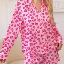 Elevate your loungewear collection with this Women’s Valentine’s Day Lounge Pajama Set, featuring a chic leopard heart print. This two-piece sleepwear set combines a long-sleeve button-up shirt and relaxed-fit shorts for a stylish yet cozy look. Perfect for lazy mornings, bedtime routines, or lounging in style, this set is crafted for women who value comfort without compromising on fashion.