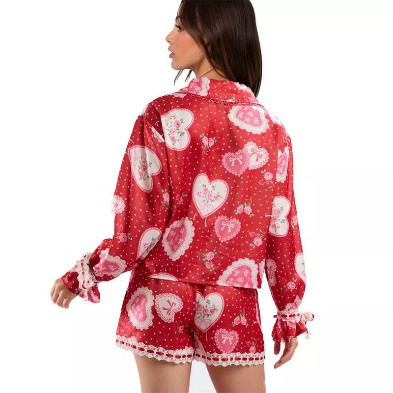 Bring a touch of romance and comfort to your sleepwear with the Womens Valentine Heart Print Pajama Set. This charming two-piece ensemble features a button-down shirt adorned with playful heart prints and coordinating ruffle shorts with a sweet bow tie detail. Made from a luxurious blend of polyester and spandex, this set is as comfortable as it is stylish. Perfect for lounging, sleeping, or celebrating a cozy Valentine’s night at home, this set combines elegance and fun effortlessly.
