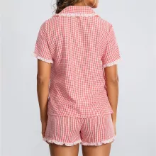 This Y2K Pink Plaid Pajama Set isn’t just about comfort—it’s a fashion statement. The pastel pink plaid adds a playful and feminine touch to your nightwear collection, while the lapel collar and short sleeves give it a timeless, sophisticated edge. With its flattering fit and charming aesthetic, it’s perfect for casual lounging, slumber parties, or even lazy weekend mornings. Embrace the spirit of the 90s with this sweet yet functional lounge set.